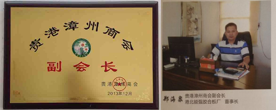 鄭海泉,男,漢族,籍貫:福建漳州市龍文區(qū),現(xiàn)擔任廣西貴港市漳州商會副會長,貴州銅仁地區(qū)福建商會常任理事長,于1987年高中畢業(yè),1988年-1998年從事運輸行業(yè),于1999年在漳州創(chuàng)辦宏晨發(fā)膠合板廠,2006年在貴州銅仁市玉屏縣創(chuàng)辦宏晨發(fā)膠合板廠(企業(yè)榮獲愛心先進企業(yè),貴州銅仁地區(qū)福建商會先進會員企業(yè)),2007年在四川廣漢創(chuàng)辦宏晨發(fā)膠合板廠,2011年在貴州凱里創(chuàng)辦宏晨發(fā)膠合板廠,2012年在廣西貴港市創(chuàng)辦能強木業(yè)有限公司,現(xiàn)任董事長。